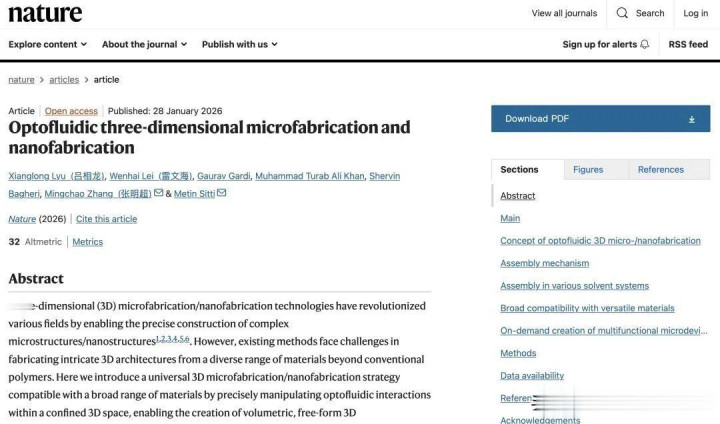 2026年1月28日,来自马克斯·普朗克研究所和新加坡国立大学的科研团队提出一种面向微米和纳米尺度的三维制造新方法,突破了以往主要依赖聚合物材料的局限。