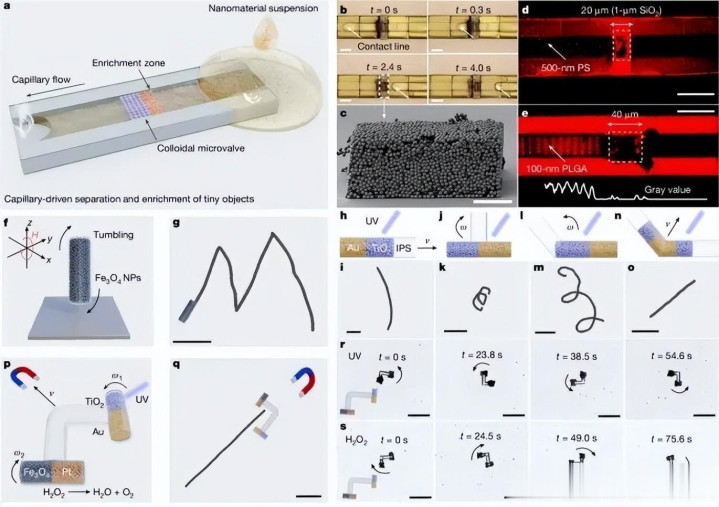 研究团队还展示了两个代表性应用。第一个上三维多孔微阀,在微流控芯片中实现纳米颗粒的尺寸筛分;另一个则是多材料微型机器人,通过集成磁性、光响应和催化材料,在不同外场下实现多种运动模式。