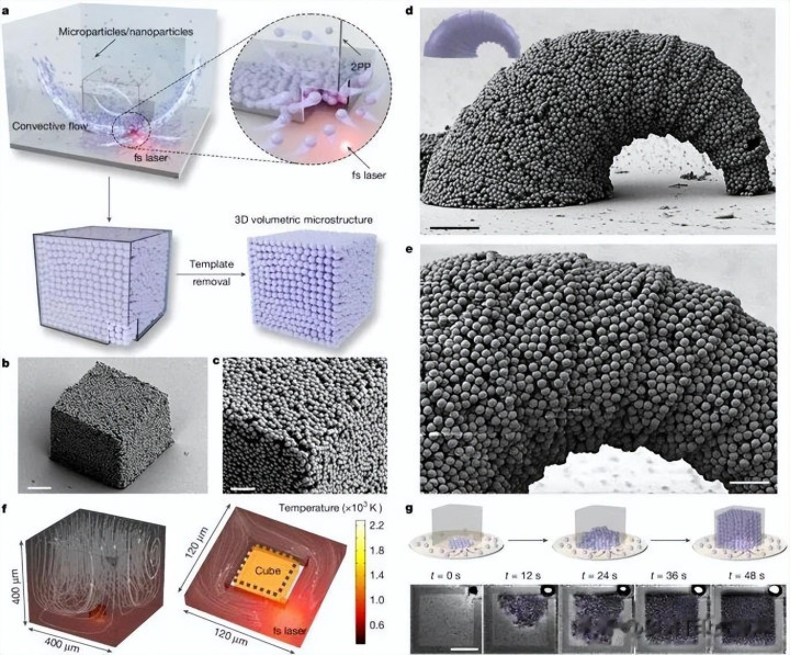 新方法的关键在于“分工”:2PP负责制造高精度三维空心模板;飞秒激光负责在溶液中产生温度梯度和对流,把颗粒持续带入模板内部并填充成形。模板去除后,留下的就是纯颗粒构成的三维结构。